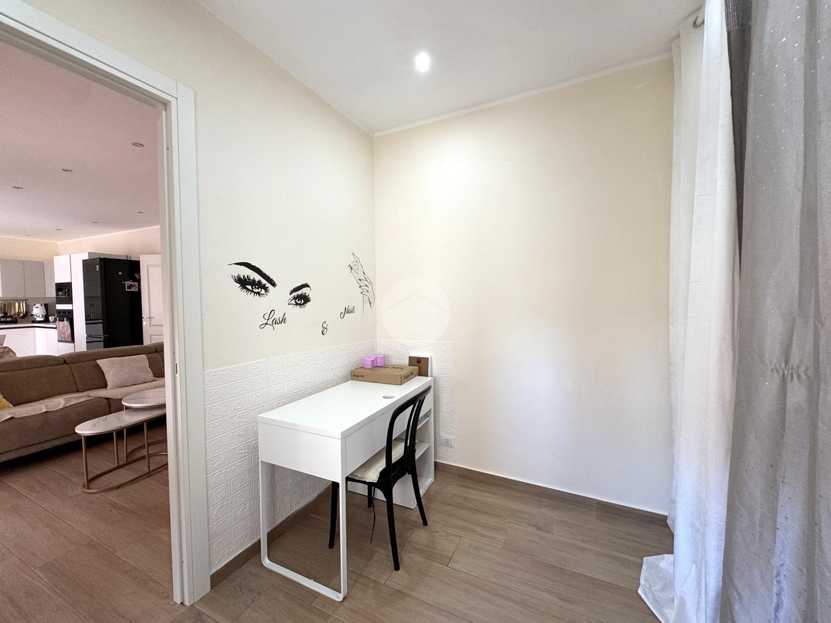 Cuore della casa è la cucina living, ampia e conviviale, pensata per vivere appieno la quotidianità e i momenti di condivisione: sia la cucina che il salotto godono di accesso diretto al balcone, rendendo l’ambiente arioso e luminoso. Completano la proprietà uno studio, perfetto per chi necessita di uno spazio dedicato al lavoro o allo studio, e un comodo ripostiglio, indispensabile per l’organizzazione della casa.